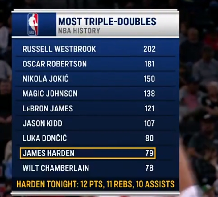 這是哈登本賽季第2個(gè)三雙,生涯第79個(gè)三雙,超越張伯倫獨(dú)占?xì)v史第8,距離東契奇僅差1個(gè)。