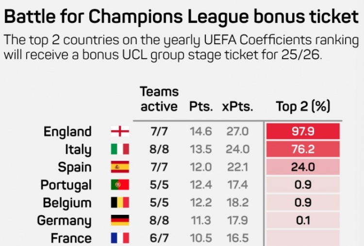1月24日訊 歐冠和歐聯(lián)杯在本周都完成了小組賽第7輪賽事,數(shù)據(jù)機構(gòu)OPTA也預(yù)測了下賽季兩個額外歐冠名額的歸屬。