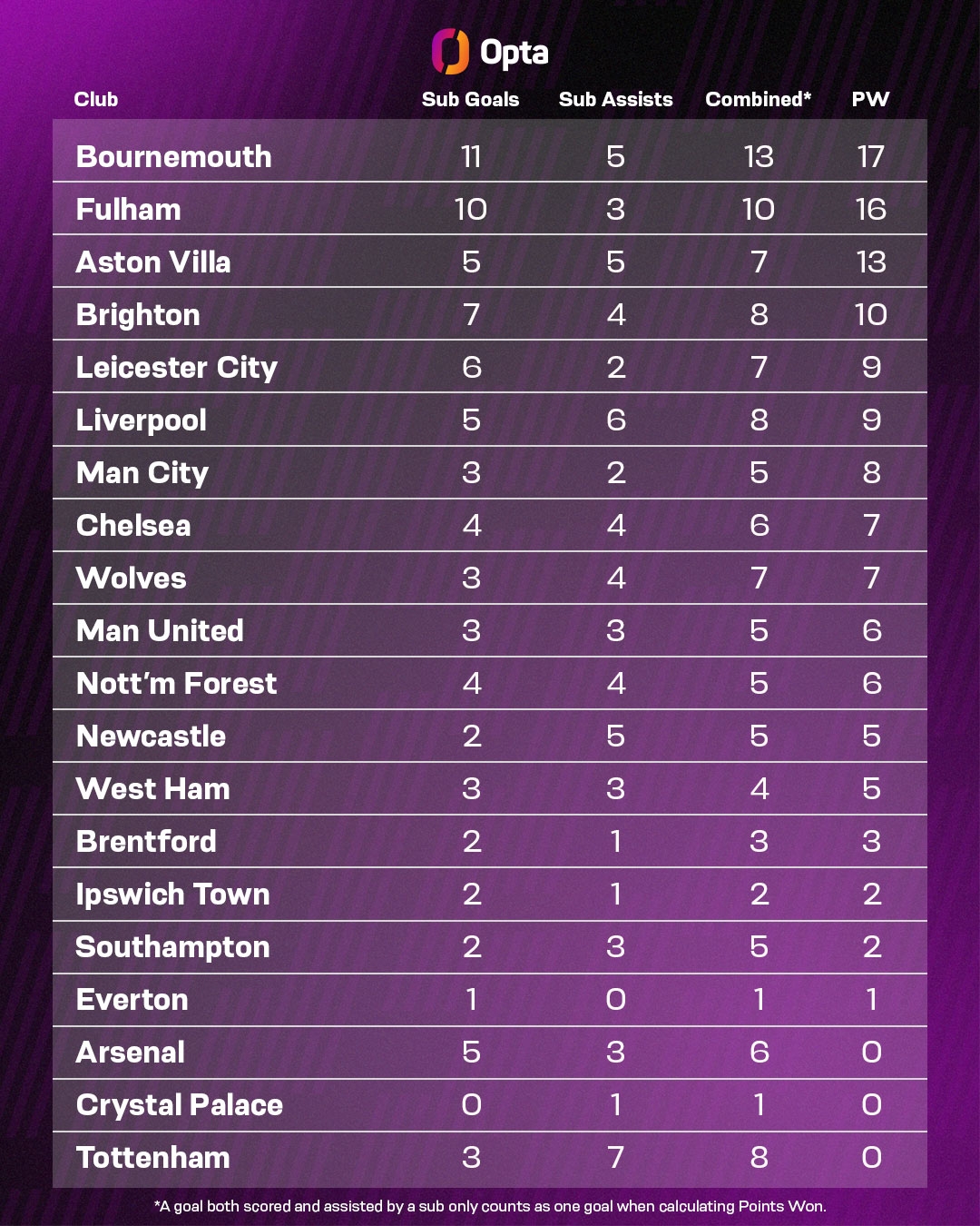 OPTA統(tǒng)計(jì)顯示,伯恩茅斯替補(bǔ)本賽季直接參與13球,為球隊(duì)贏下17分,均為聯(lián)賽最多。富勒姆(16分)、阿斯頓維拉(13分)和布萊頓(10分)的替補(bǔ)表現(xiàn)也相當(dāng)出色。