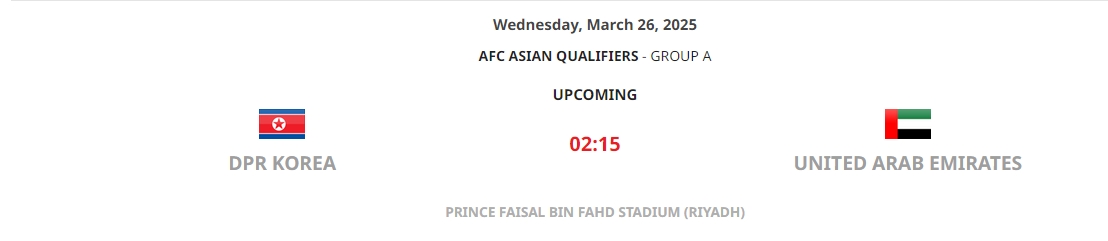 亞足聯(lián)官網(wǎng)顯示:朝鮮主場對陣阿聯(lián)酋的比賽,將在沙特利雅得進行