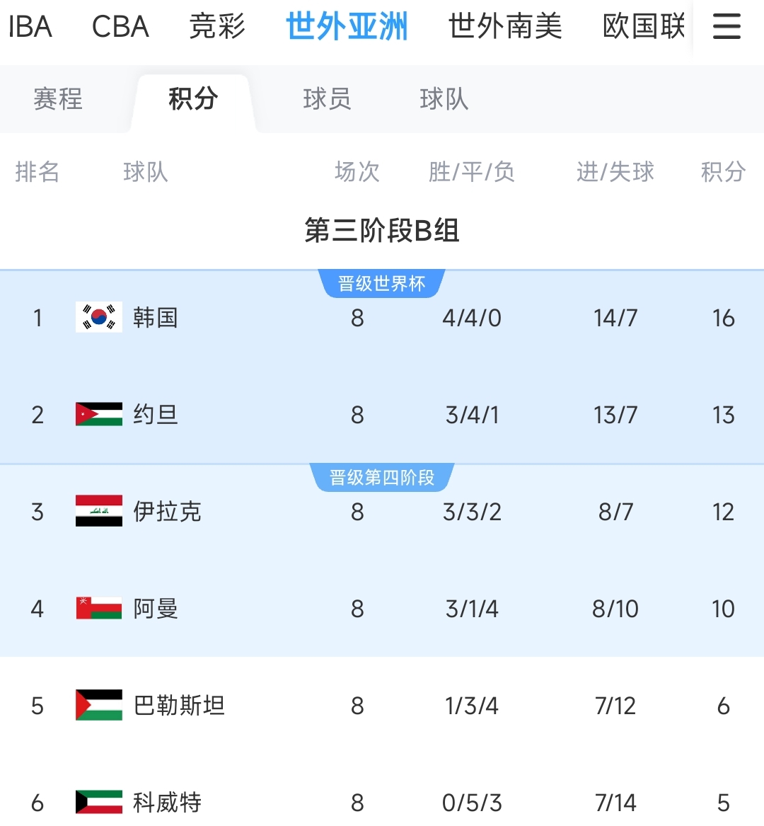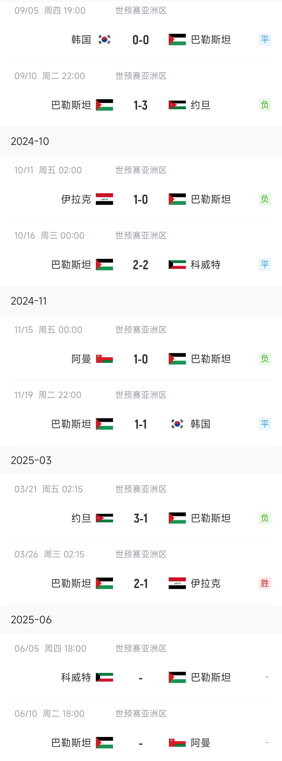 18強(qiáng)賽B組積分榜上,巴勒斯坦積6分排名小組第5,依然存在小組前四晉級(jí)附加賽的希望。在18強(qiáng)賽前8輪比賽中,巴勒斯坦取得1勝3平4負(fù),其中兩回合交手韓國(guó)隊(duì)均取得平局。