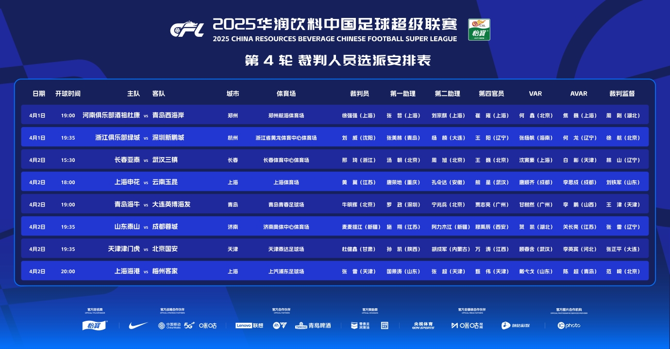 中超第4輪裁判安排:麥麥提江執(zhí)法泰山vs蓉城,無馬寧信息